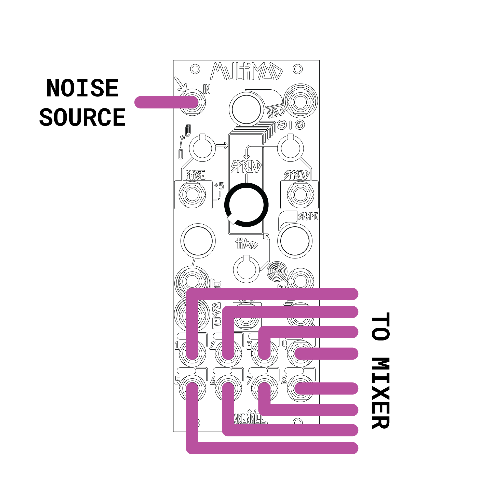Patch a noise source to the Multimod's Input and patch the Multimod's outputs to a mixer. Use Time and Spread on the Multi-Mod to set the relative pitch/color of these outputs and use the mixer to set their levels. Great for gritty, lower-fi noise textures, chiptune drums, etc.