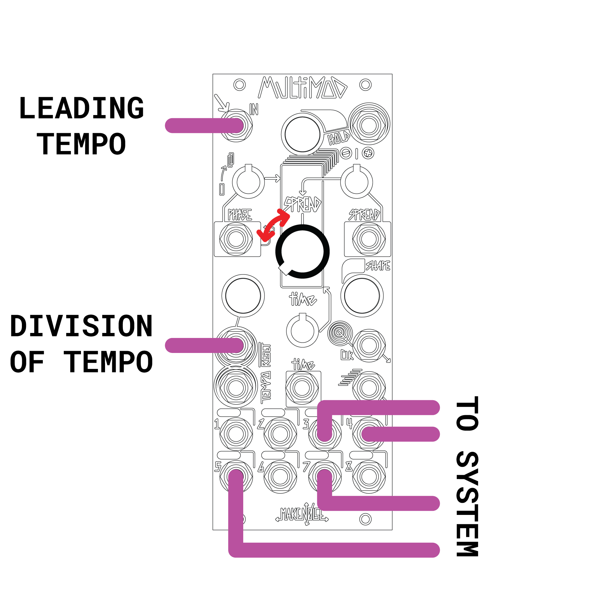 Patch a leading tempo to the Multimod's Tempo input and patch the Multimod's outputs however you like within your system. Set Spread however you wish to best suit your patch. Patch a division of the leading tempo (say /8) to the Reset input. In this way, while the Multimod's outputs will drift out of sync with one another, they will snap back into momentary alignment with the arrival of the Reset pulse.